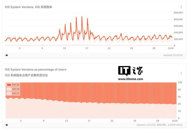 IT之家查询公开资料,不过作为第二个参考数据,TelemetryDeck的数据显示iOS26的普及率要高得多,约60%的用户使用最新系统版本,而约37%的用户仍然使用iOS18。