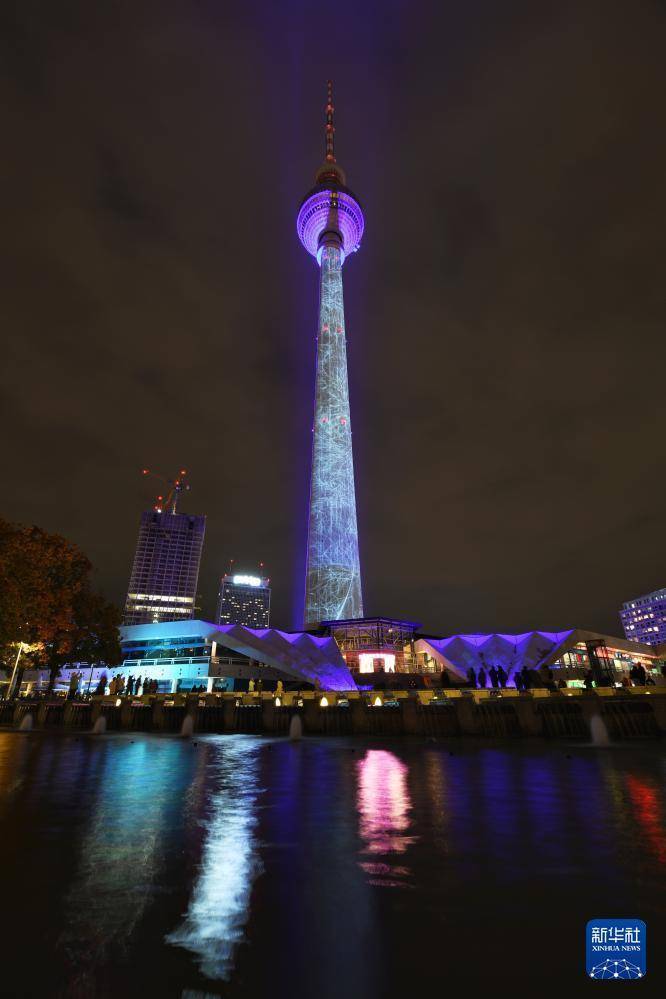 10月9日,德国柏林电视塔被灯光点亮(长时间曝光)。