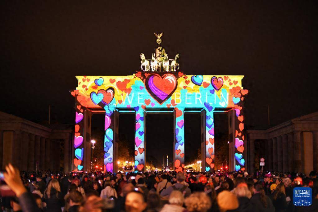 10月9日,德国柏林勃兰登堡门被灯光点亮。